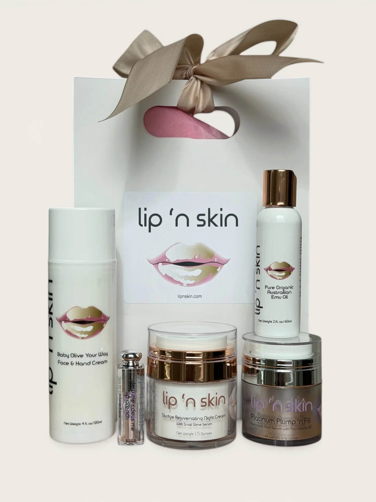 Included is a 2 ounce Emu Oil, a 1 ounce Platinum Plump Hyaluronic Acid Serum, Baby Olive Your Way Face & Hand Cream, one Dew Me Deux Me Lip Drench, and Sludge Rejuvenating Night Cream with Snail Serum, an incredibly well rounded night cream. Everything she needs to hydrate, moisturize, and revamp the skin while she sleeps.